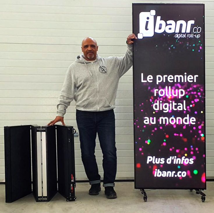 L’un expose des produits et panneaux LED, l’autre se renseigne et explique avoir développé un produit sur la base d’un Kakemono dynamique à LED !